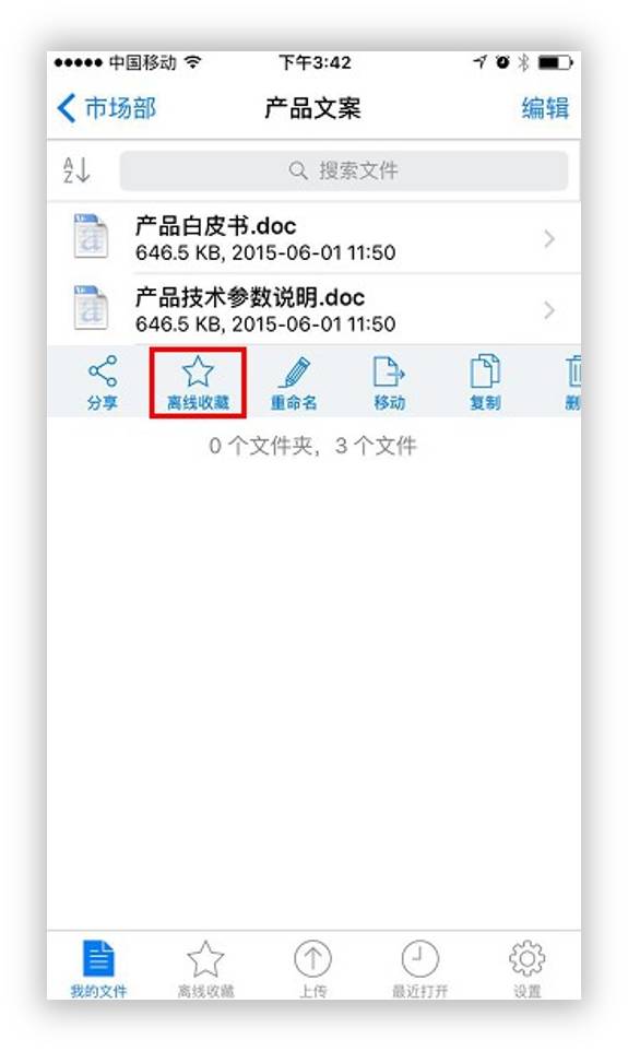 在假期开始前,把可能会用到的工作资料提前在坚果云App上离线收藏吧,在没有网络的情况下,您可以通过访问坚果云中离线收藏的文件夹访问需要用到的文件,等到有网络的时候坚果云会自动更新上传,无需手动操作,方便快捷。